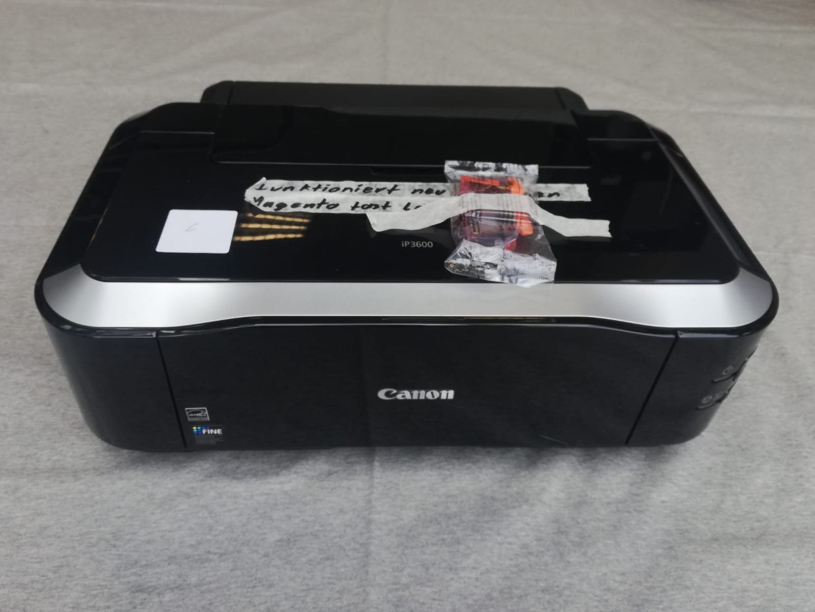Multifunktionsdrucker iP3600 von Canon, inklusive Lade- und Anschlusskabel. Eine neue Patrone Magenta gibt es zusätzlich dazu, die anderen Farben sind noch gefüllt.